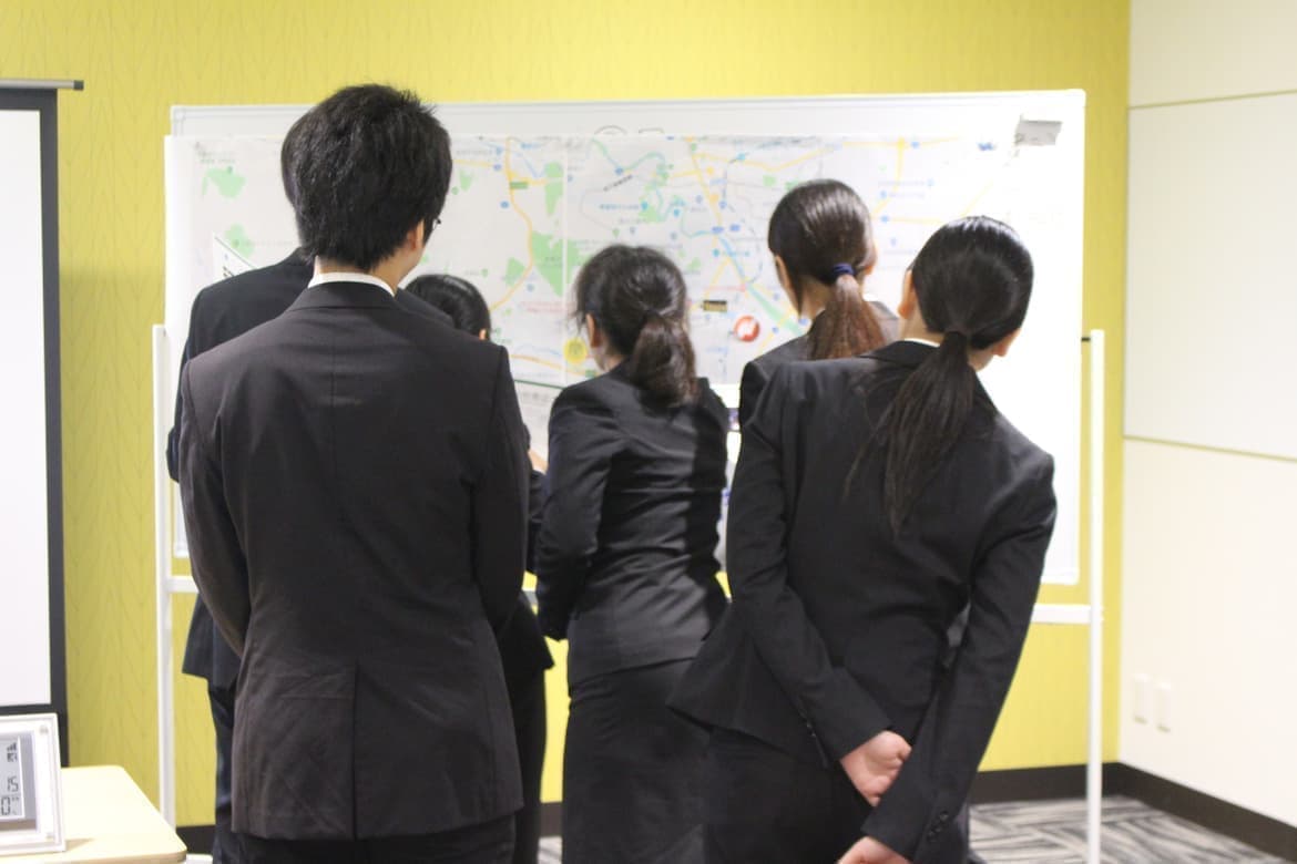 大きな地図を広げ、エリアの用途地域や開発状況を確認していきます。